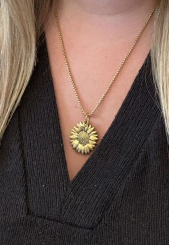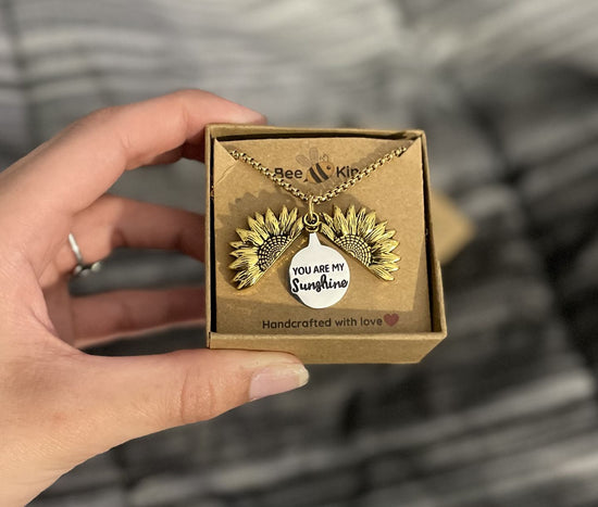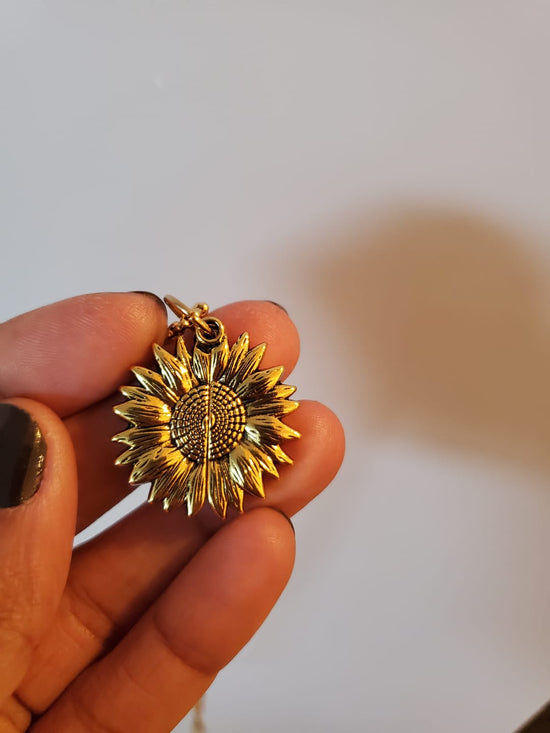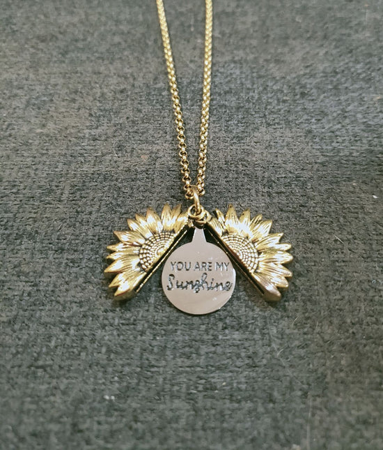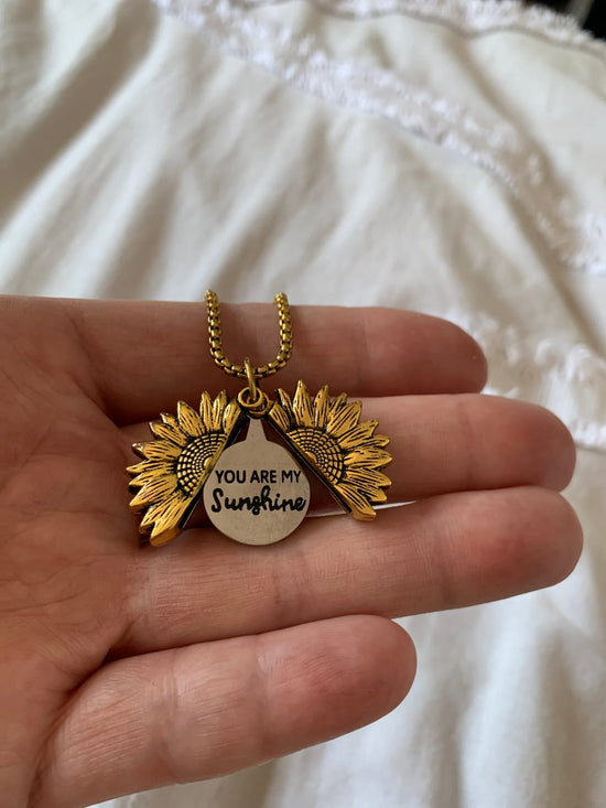 Alltid på utkikk etter originale smykker, jeg falt for dette solsikkekjedet. Den åpne anheng som avslører "You Are My Sunshine" er et innovativt og følelsesladet preg som jeg aldri har sett før.