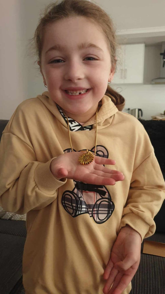 Dette kjede er et underverk. Solsikken åpner seg delikat for å avsløre en rørende inskripsjon. Det er et smykke jeg vil verne om lenge.